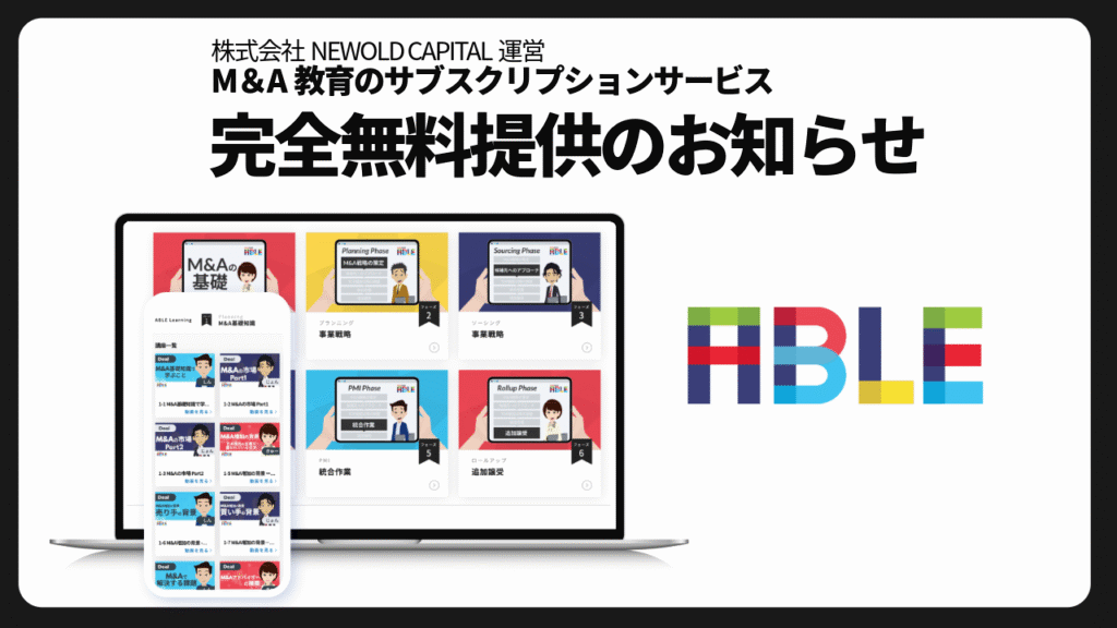 中堅・中小企業向けのM&Aアドバイザリーを主軸として成長戦略の支援をする株式会社NEWOLD CAPITAL(本社:東京都渋谷区、代表取締役CEO:栗原 弘行、以下「NEWOLD」)は、M&A教育のサブスクリプションサービス「NEWOLD ABLE」の完全無料提供を開始したことをお知らせいたします。