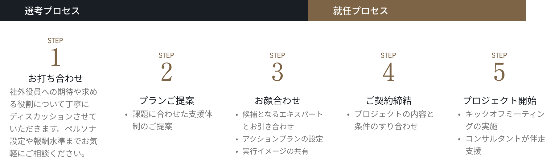 当社は紹介制によるご提案を基本としているため、信頼できるネットワークを活かし、適切かつ独立性を担保する人材選定をご支援します。