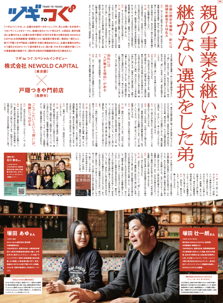 本記事は、人・起業の次世代への挑戦や先人の思いを次世代へつなぐことをテーマにした「ツギtoつぐ」という連載企画の第4回として掲載されたものです。今回は、当社取締役COOの塚田壮一朗と、戸隠つきや門前店を営む実姉・塚田あゆ氏との対談形式で構成されています。